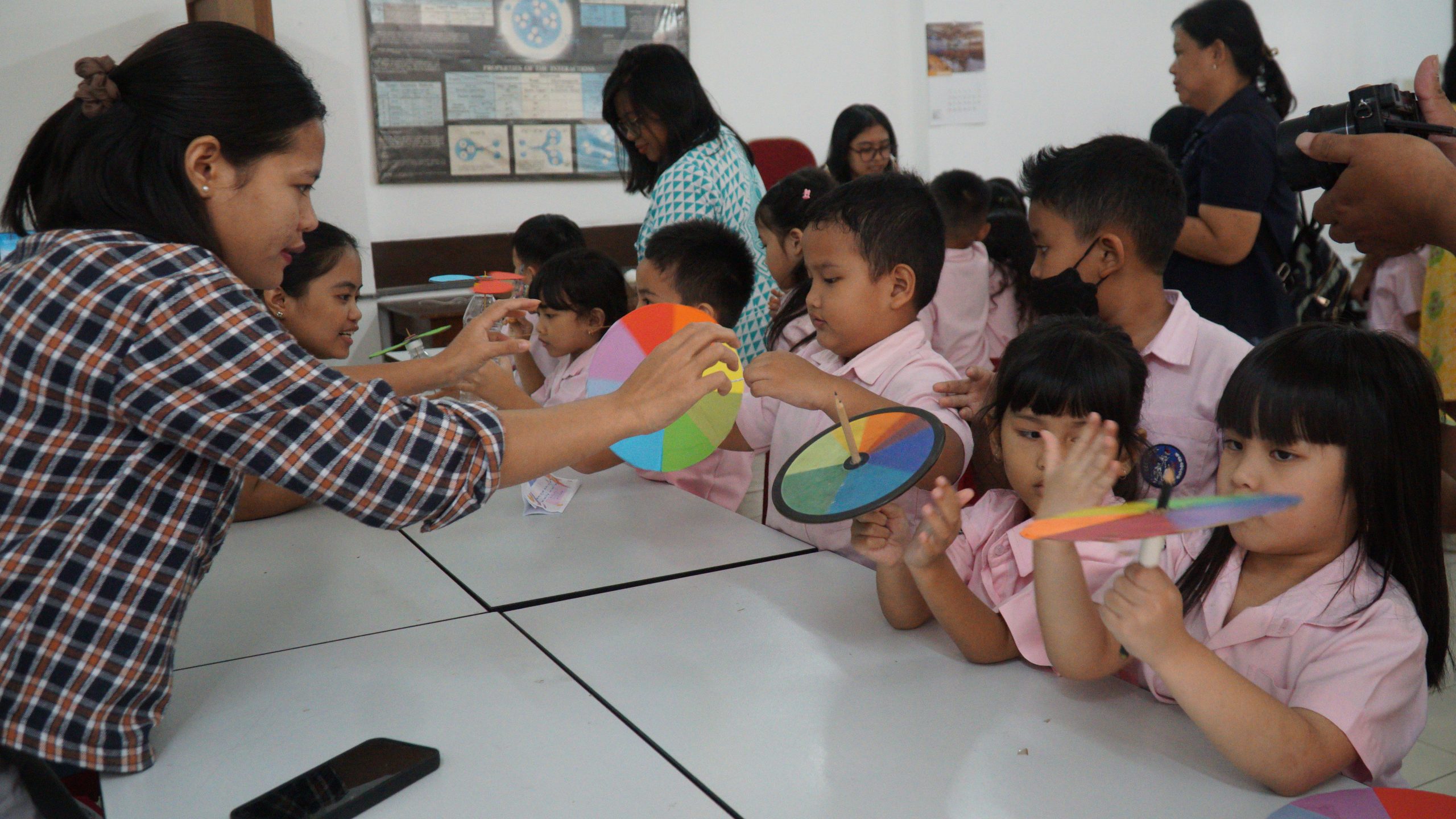 Keceriaan tidak hanya dirasakan pengajar, namun juga anak-anak KB, TK Kristen Satya Wacana. Beatrice Hanna Sharon Widodo, salah satu siswa, dengan penuh antusias mengatakan perasaan gembiranya. “Senang banget! Seru! Tadi aku main mancing ikan-ikanan pakai magnet, bikin kincir angin, sama lihat pelangi. Aku mau coba eksperimen ini lagi di rumah,” kata Beatrice. Geraldus Luhut Pangarep Simaremare juga menyatakan kegembiraannya, “Senang. Tadi main kincir angin. Aku pengen lagi!”