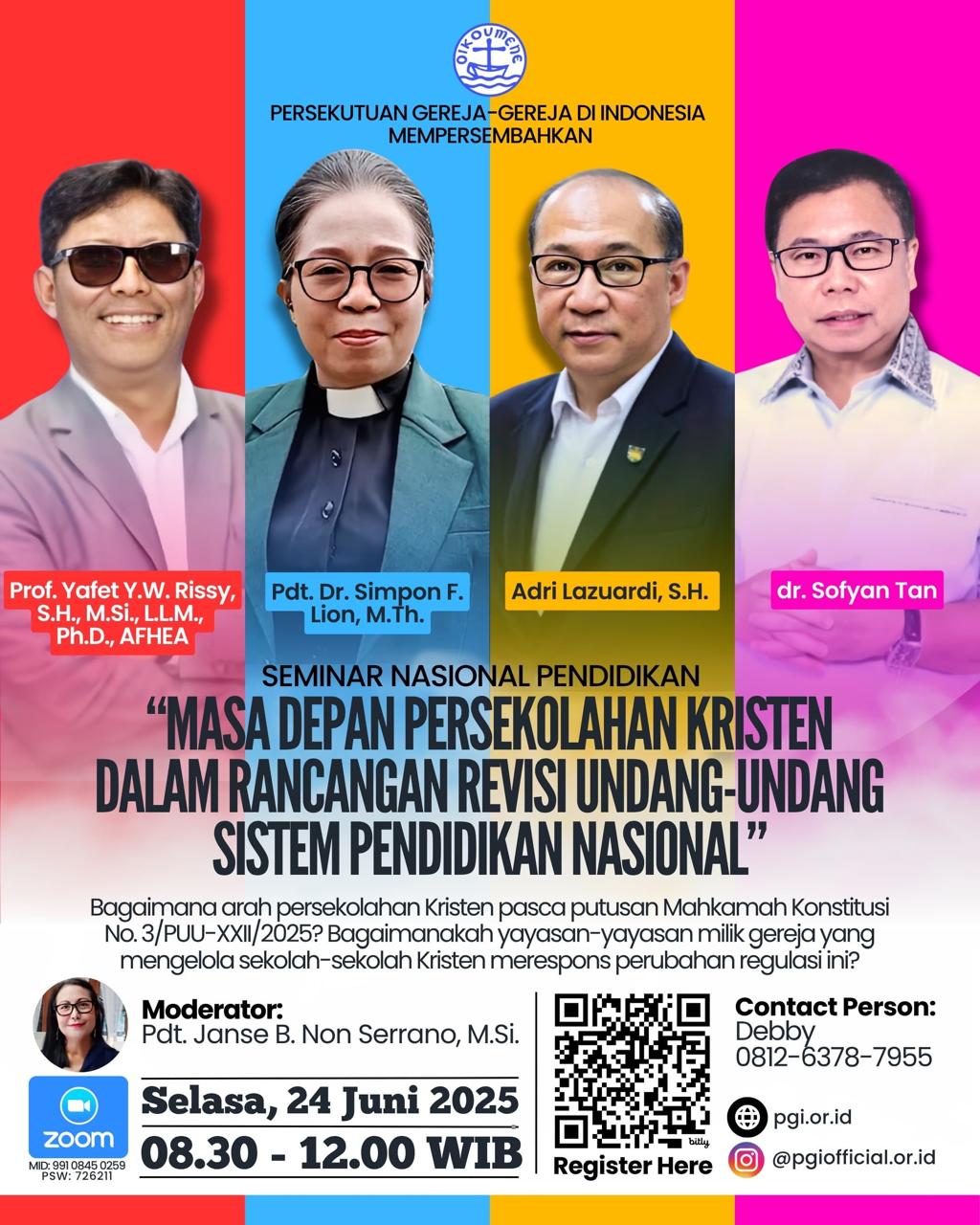 Seminar yang berlangsung Selasa, 24 Juni 2025 pukul 08.30-12.00 WIB ini menerima registrasi melalui barcode yang terlampir pada sisi lain tulisan ini. Ataupun pada kontak person 0812-6378-7955 (Debby). (BOY)